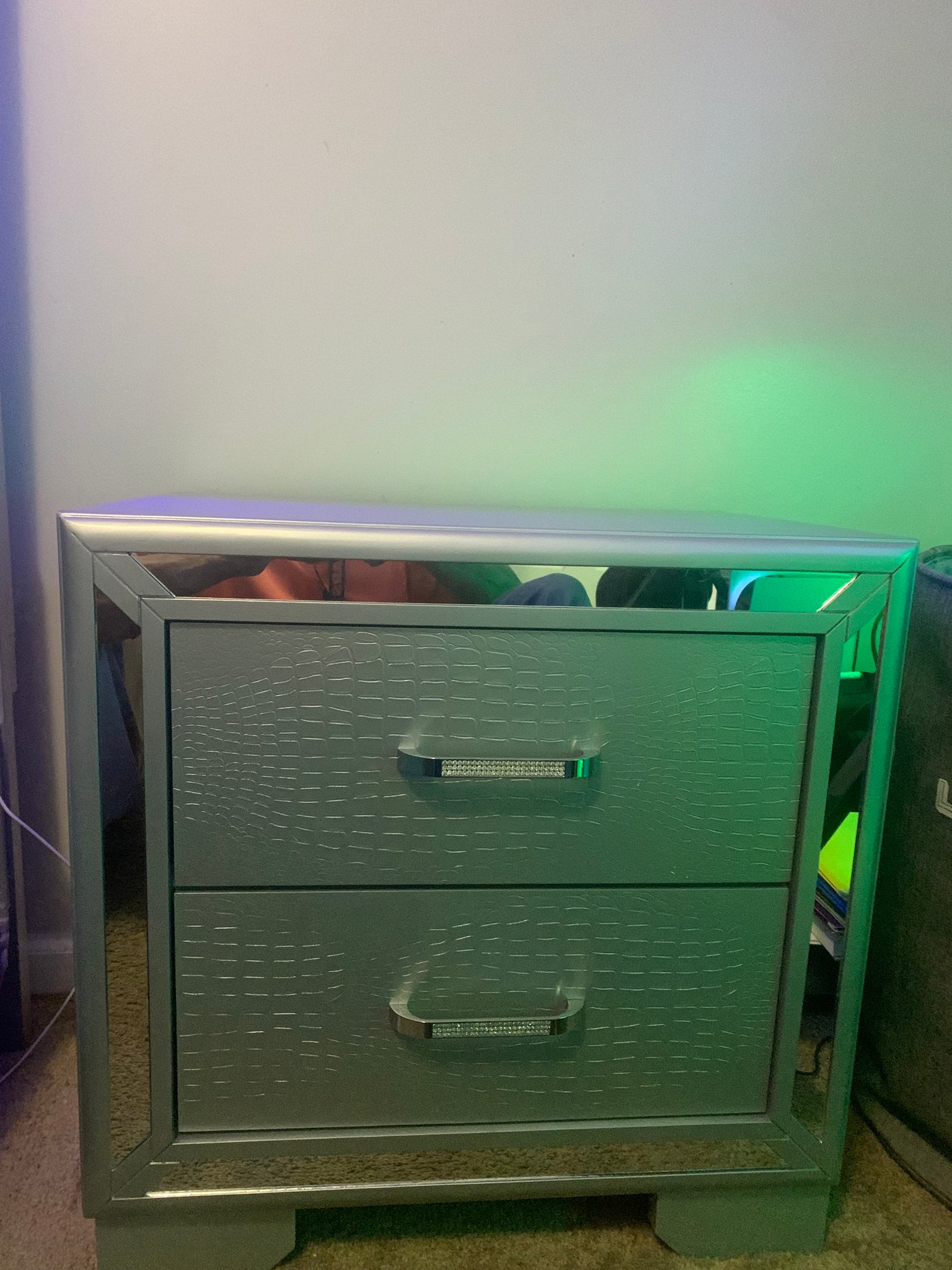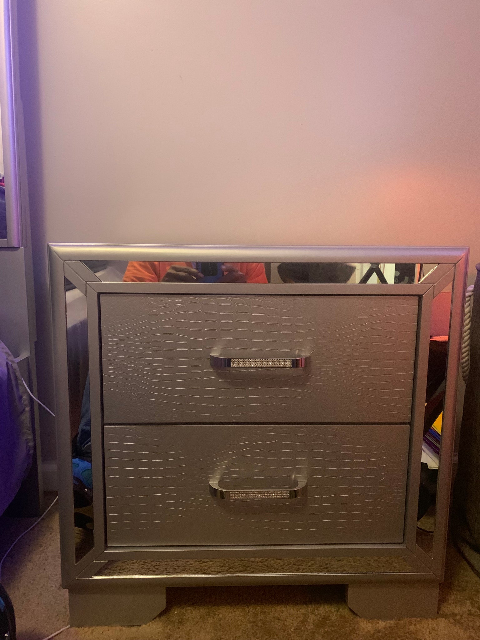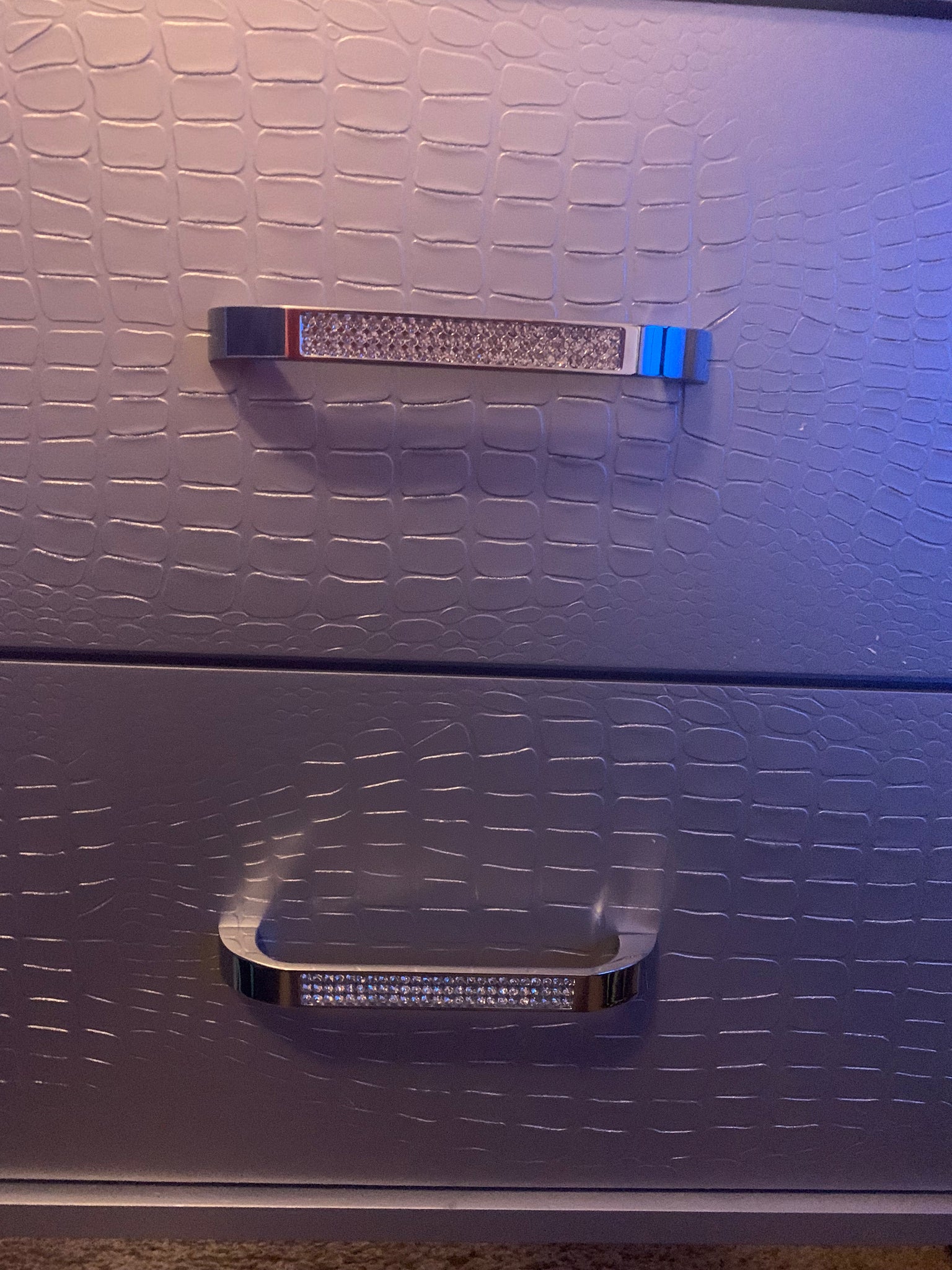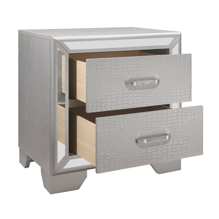 Elegant touches abound with the design of the Aveline Collection. Alligator embossed veneer covers the collection and is finished in silver, an elegant palette that beautifully pairs with your bedroom’s accessories. The nightstand is framed with mirror trim, while the drawers are fronted with chrome-finished faux-diamond inlay bar hardware, each accent a perfect decorative touch to reflect your glamorous style.